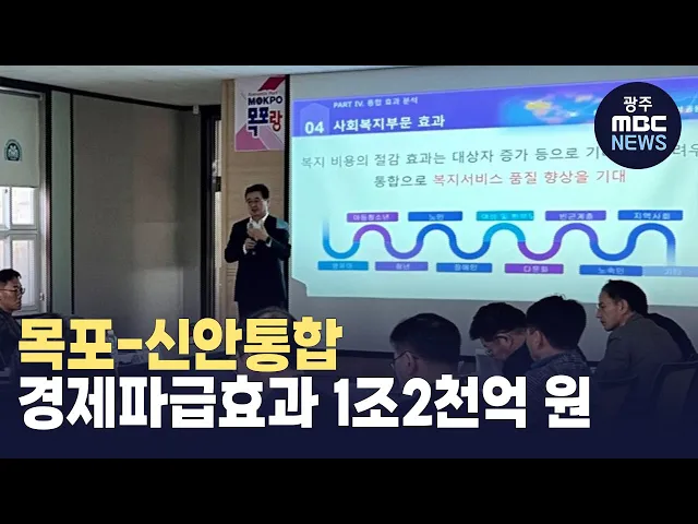 목포시와 신안군이 통합하면 경제파급효과가 1조2천억 원에 이를 것이라는 전망이 나왔습니다.목포대학교가 목포시와 신안군의 통합효과분석 공동연구 용역 중간보고회에 따르면 행정편익은 4천5백85억 원으로 비용 63억 원보다 훨씬 큰 것으로 나타났고경제파급효과는 1조2천억 원, 관광객도 오는 2천27년에 2천2백만에 이...