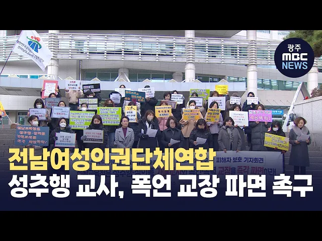 전남여성인권단체연합은지역의 한 학교에서 동료 교사들에게 성추행과 성희롱을 한 가해교사를파면할 것을 전남교육청에 촉구했습니다.또 가해교사를 두둔하고피해 교사에게 욕설을 한 해당 학교도 중징계 할 것을 요구했습니다.여성단체는 성추행 등을 한 가해교사는 수사를 받고 있고해당 교장은 피해교사를 상대로 2차 ...