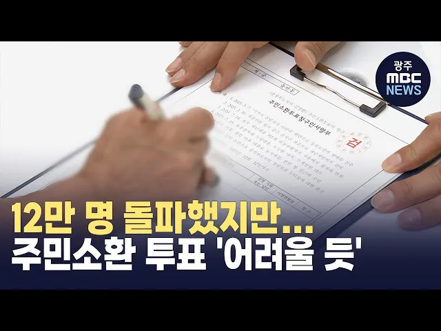 (앵커)지난 8월 시작된 김영환 충북지사에 대한주민소환 청구인이 12만 명을 넘어섰습니다.서명 마감인 12일까지 일주일 정도밖에 남지 않았는데,투표 요건을 채우기는 사실상어려울 것으로 보입니다.MBC 충북 김대웅 기자입니다.(기자) 지난 8월, 오송 참사에 대한 책임을 물어 김영환 충북지사에 대한주민소환 서명 절차...