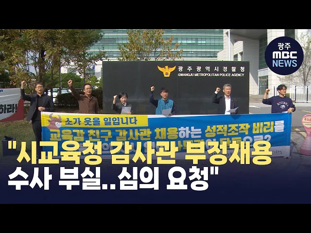 이정선 광주시교육감 고교 동창생감사관 부정 채용 의혹 사건과 관련해 수사가 부실했다며 광주지역 교원단체들이 경찰에 수사심의를 요청했습니다.전교조광주지부 등은 어제(16)광주경찰청 앞에서 기자회견을 열고"경찰은 1년이 다 된 최근 이정선 교육감을불송치 했다는 수사결과를 고발인들에게통보했지만, 누구도 고발...