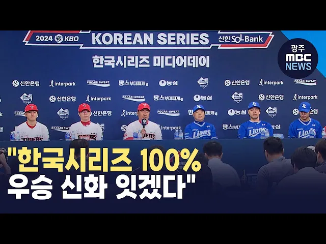 (앵커)7년 만에 한국시리즈 무대에 직행한기아 타이거즈가12번째 우승의 역사를 쓰겠다고 약속했습니다.31년 만에 호랑이와 사자가 왕좌 자리를 놓고 겨루게 됐는데,이범호 감독은 한국 시리즈 100% 우승 신화를 이어가겠다고출사표를 던졌습니다.한신구 기자가 보도합니다.(기자)"한국시리즈 불패 신화의 빛나는 전통을 이...