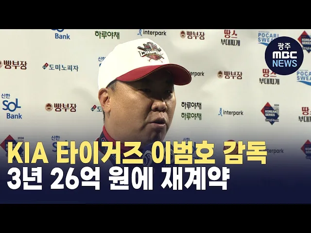 KIA 타이거즈를 승리로 이끈 이범호 감독이 현역 사령탑 최고 대우로 재계약 했습니다.프로야구 KIA 구단은 "2024 시즌 통합 우승을 일군 이범호 감독과 계약기간 3년간 연봉 5억 원 등 총액 26억 원에 계약했다"고 발표했습니다.이범호 감독은 지난 2월 계약기간 2년간 9억 원에 사인했는데, KIA가 우승 성과를 높게 평가...