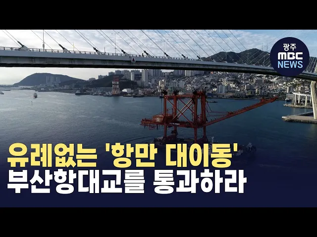 (앵커)부산 북항재개발 2단계를 위해, 자성대부두를 완전히 비우는 '유례없는 항만 대이동'이 진행되고 있습니다.부산항대교를 통과하기 위해 대형 크레인 높이를 낮춰, 배에 실어 나르는 해상 운송이 한창입니다.부산문화방송김유나 기자입니다. (기자) 대형 크레인이 바지선에 실려 부두를 떠납니다.부산항대교가 가까워...