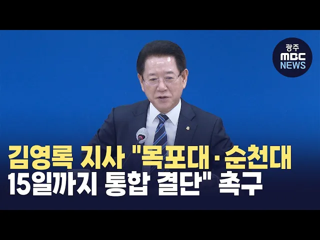 김영록 전남지사가 전남국립의대 공모마감일인 오는 15일까지목포대와 순천대의 신속한 통합 결단을 촉구하고 나섰습니다.김 지사는 오늘(12일) 도청에서 열린 실국장 회의에서 여야의정협의체가 출범돼 첫 회의를 가졌다며의대신설을 협의체 안건으로 논의하기 위해서는시간이 많지 않다고 전제했습니다.김 지사는 이에 따...