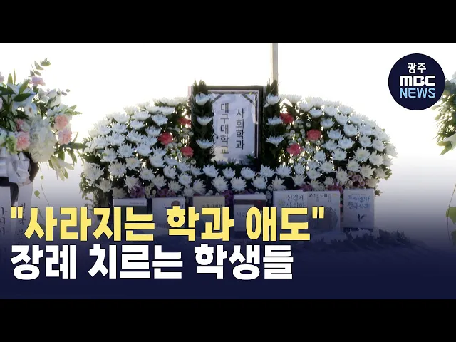 (앵커)지역 대학교가 신입생을 모집하고 있는데,학령 인구 감소, 수도권 집중 등으로애를 먹고 있습니다.최근 대구지역 한 대학교는 심지어 사회학과와법학부 등도 없애기로 결정했는데요.학생들은 사라지는 학문을 애도한다며장례식을 치렀습니다.대구문화방송 손은민 기자가 보도합니다. (기자)국화로 둘러싸인 단상 위에...