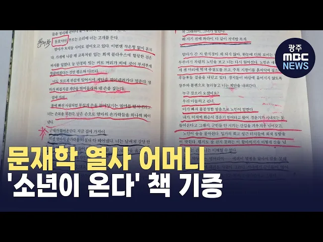 한강 작가를 노벨문학상으로 이끈 작품 '소년이 온다'의 실제 주인공 유족인문재학 열사의 모친 김길자 여사가 유족들의 눈물이 젖은 '소년이 온다' 책을 광주시에 기증했습니다.이 책은 문 열사의 부친 故 문건양 씨가 생전에 읽던 것으로,아들을 그리워하며 흘린 눈물 자국과 열사의 이름을 적은 메모 등이 남아있습니다....