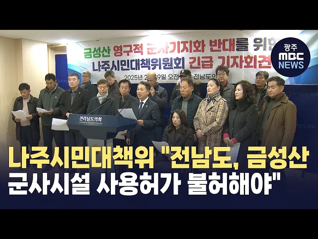 국방부가 나주 금성산 정상 부지를영구적으로 군사기지화 하려는 것에나주시민단체가 즉각 반발했습니다.나주시민대책위원회는 어제(19) 기자회견을 열고 "국방부가 신규 무기체계 전력화를 목표로 금성산의 정상 부지 매각 또는 장기 임대하려 한다"면서"정상 부지의 소유권을 가진 전남도는 군사시설 사용허가를 불허해야...