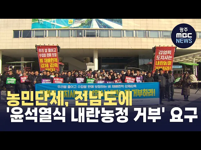 전남의 농민단체들이 벼 재배면적 조정제 등 윤석열식 내란농정을 전라남도가즉각 거부해야한다고 주장했습니다.전국농민회 광주전남연맹 등 7개 단체는 오늘(9) 전남도청 앞에서 기자회견을 열고쌀 자급률이 94%인 우리나라에서 수입쌀을 안정적으로 판매하기 위해 국내 쌀 생산기반을 무너뜨리려 한다며 이같이 주장했습...