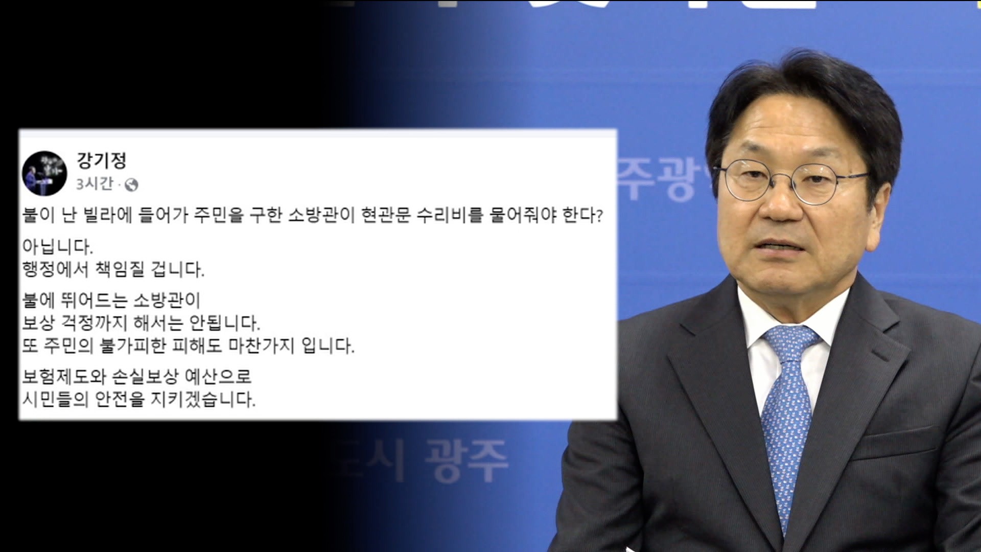 화재 인명구조를 위해강제 개방한 현관문 수리비를 배상할 위기에 놓였던 소방관을 대신해광주시가 지원에 나섭니다.강기정 광주시장은 자신의 SNS에 "소방관이 보상 걱정까지 해서는 안 된다"며 "보험 제도와 손실 보상 예산을 활용해행정에서 책임지겠다"고 밝혔습니다.광주 북부소방서는 지난달 신안동 빌라 화재를 진압...