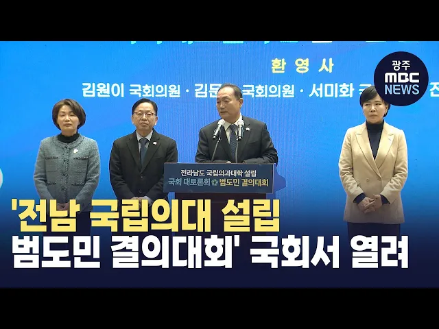 전남 국립의대 신설 정원 200명 우선 배정을 촉구하는 범도민 결의대회가 오늘(24) 국회에서 열렸습니다.김원이 의원 등 10여 명의 국회의원 공동 주관으로 열린 행사에서는 김영록 지사와 양 대학 관계자들을 비롯해전남 출신 향우 등 500여 명이 참석했으며, 정부의 신속한 결의를 촉구하는 결의문 낭독과 피켓 퍼포먼스 ...