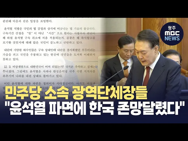 강기정 광주시장, 김영록 전남지사 등더불어민주당 소속 시도지사들은 "윤석열 탄핵은 대한민국 존망의 문제"라며 조속한 파면을 촉구했습니다.광주, 전남, 전북, 제주, 경기 시·도지사 5명은 오늘(10) 공동 입장문을 내고 "윤석열이 대통령직에 복귀한다면 제2의 비상계엄을 선포해 나라를 절단 낼 것"이라며이 같이 강조...