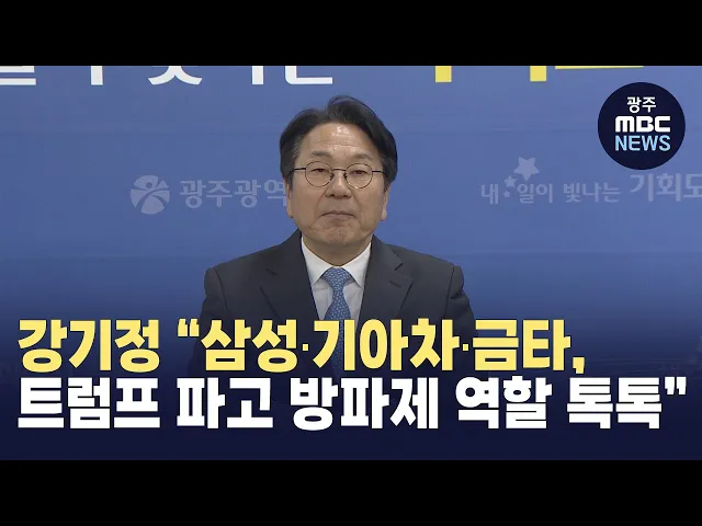 삼성전자, 기아자동차, 금호타이어 등광주 주요 대기업들이 트럼프발 관세 파고를 막아 줄 방파제 역할을 하고 있다고 강기정 광주시장이 평가했습니다.강 시장은 오늘(11) 정례 차담회에서"금호타이어는 올해 매출 목표를 작년보다 높은 5조원으로,기아차는 3년 연속 50만대 이상 생산을 목표로자기혁신에 매진하고 있다"...
