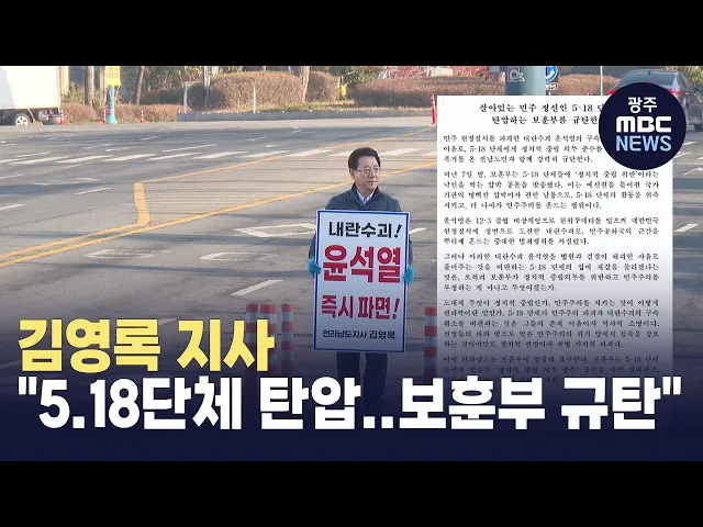 김영록 전남지사가 윤석열의 구속취소를 비판했다는 이유로 5.18 단체에게 정치적 중립의무 준수를 요구한보훈부를 전남도민과 함께 강력히 규탄한다고밝혔습니다.김지사는 어제(12일) 이와 관련해 성명서를 발표하고 보훈부가 "5.18 단체들에게 정치적 중립위반이라는 낙인을 찍은 압박 공문을 발송한 것은민주주의를 흔드...