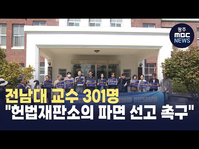 전남대학교 교수 301명이오늘(2) 윤석열 대통령 파면을 촉구하는시국선언문을 발표했습니다.교수들은 선언문에서"전 국민이 목격한 대통령의 헌정질서 파괴행위에 준엄한 심판을 내리지 못하는 헌법재판소라면 존재할 이유가 없다"며"헌법재판소가 파면 선고를 하지 않는다면 지체된 정의를 회복하기 위한 주권자의 직접 행...