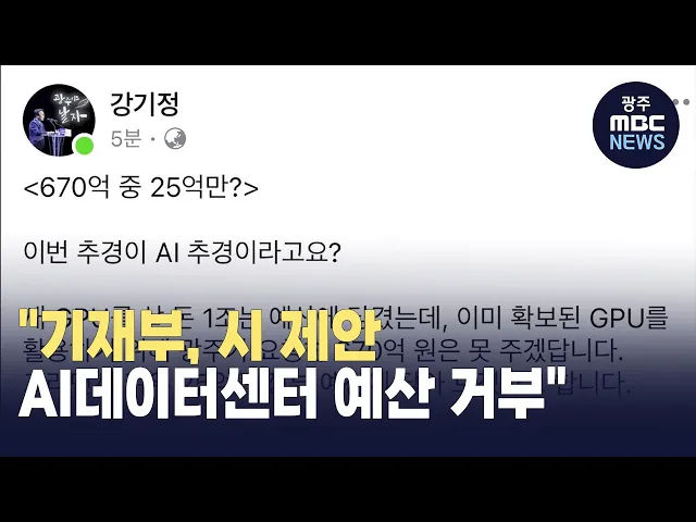 국가인공지능데이터센터에 있는그래픽처리장치, GPU를 모두 사용할 수 있는 예산이정부 추가경정예산에 반영되지 못하고 있습니다.강기정 광주시장은 오늘(16일) 오전 자신의 SNS에시가 요청한 예산은 670억 원인데, 기재부는 광주의 지역 사업이라는 이유로25억 원만 담겠다 했다고 밝혔습니다.강 시장은 국가인공지능데이...
