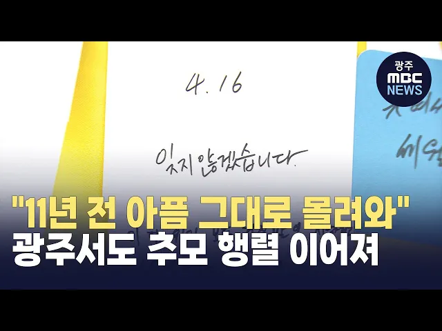 (앵커)세월호 참사 11주기를 맞아희생자들을 추모하는시민들의 발걸음이 이어졌습니다.이 자리엔 이태원 참사 유가족들도 함께 해세월호 참사를 끝까지 기억하고보다 더 안전한 사회가 만들어지길 바랐습니다.천홍희 기자가 보도합니다.(기자)하얀 천이 5.18 광장에 펼쳐집니다.노란 꽃을 든 시민들은 흰 천 사이를 걸어갑...