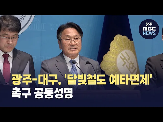 광주시와 대구시, 지역 국회의원들이 만나달빛철도 예비타당성조사 면제를정부에 촉구했습니다.이들은 오늘(23일) 오후 국회에서 특별법이 명시한 예타 면제를 확정하고범정부적 지원을 약속해 달라는 공동성명을 발표했습니다.달빛철도는 호남과 영남의 6개 시‧도를 지나는 열차로,지난해 관련 특별법이 국회를 통과하고예...