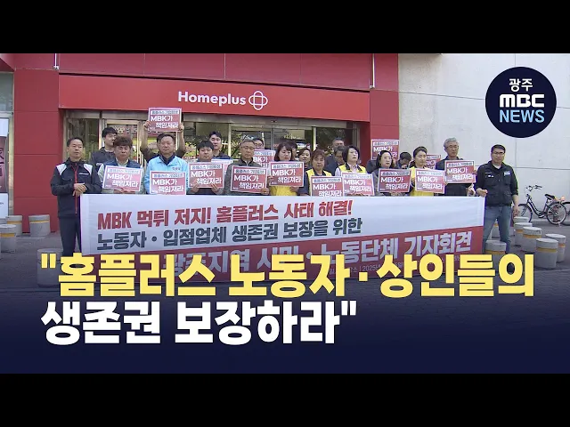 민주노총 광주본부는 오늘(25) 기자회견을 열고 "홈플러스 노동자와 상인들의 생존권을 보장하라"고 촉구했습니다.단체는 "지난 2015년 홈플러스를 인수한 사모투자펀드 운용사 MBK파트너스는 투자 대신 자각 매산, 인력 감축 등에만 집중하고 있다"며 "광주에서는 2개 점포에서 약 2천 명의 노동자와 상인들이 구조조정의 ...