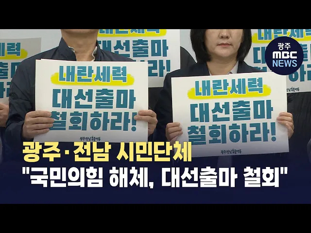광주·전남 시민단체들이정당 해체와 대선출마 철회를 국민의힘에 촉구했습니다.지역 시민단체 30여 곳은 오늘(9일) 오후 광주시의회에서 기자회견을 열고,"내란으로 치러지는 대선에 가장 큰 책임이 있는 국민의힘이아무런 반성도 없이 재집권을 노린다"며 비판했습니다.그러면서 "윤석열 전 대통령의 범죄를 비호하고내란...