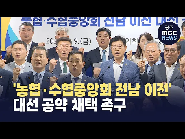 전라남도의회 농수산위원회는 오늘(9일) '농협·수협중앙회 본사의 전남 이전'을 대통령선거 후보자들이 공약으로 채택할 것을 촉구했습니다.김문수 위원장은 성명서를 통해"전남은 전국 농작물 생산량의 19%, 수산물 생산량의 59%를 책임지는 농어업 중심지"라며 "현장을 모르는 중앙회는 무의미하다. 농협과 수협 본사는 ...