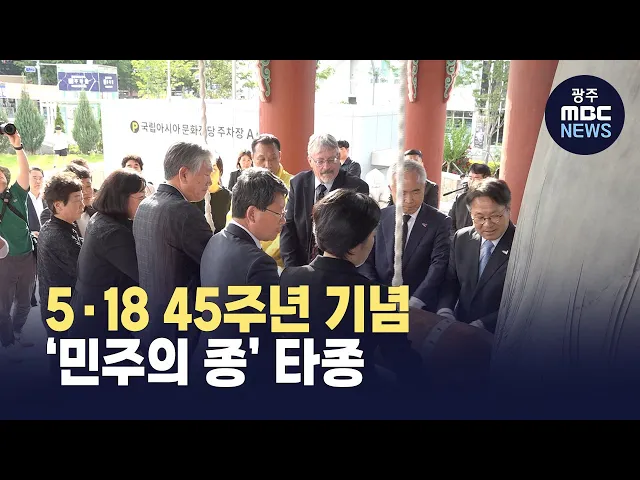 5.18민주화운동 45주년을 기념하기 위해오늘(18) 오후 5시 18분 국립 아시아문화전당 앞 민주의 종각에서 '민주의 종 타종식'이 진행됐습니다.참석자들은 5.18 정신 계승과 함께 나눔과 연대의 오월 정신이 전 세계로 확산되길 기원하며33차례 타종했습니다.