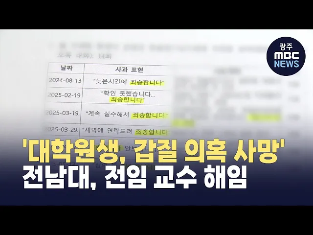 전남대 대학원생 사망 사건과 관련해갑질 의혹을 받는 전임 교수가 해임됐습니다.전남대는 최근 징계위원회를 열어숨진 대학원생이 과도한 업무가 있었다는진상조사위 결과를 토대로모 교수에 대해 해임 징계를 결정했습니다.함께 갑질 의혹을 받는 비전임 교원은 지난 달 계약이 종료됨에 따라 해고됐습니다.지난 7월 숨진...