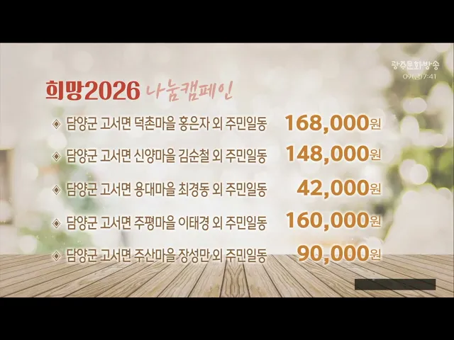 다음은 '희망 2026 나눔 캠페인'에 성금을 보내주신 분들입니다.'담양군 담양읍 이귀헌 99,800담양군 담양읍 최봉례 200,000담양군 담양읍 강쟁1구 마을주민 일동 200,000담양군 담양읍 강쟁3구 마을주민 일동 150,000담양군 담양읍 학동1구 마을주민 일동 250,000담양군 담양읍 향교3구 마을주민 일동 100,000담양군 담양...