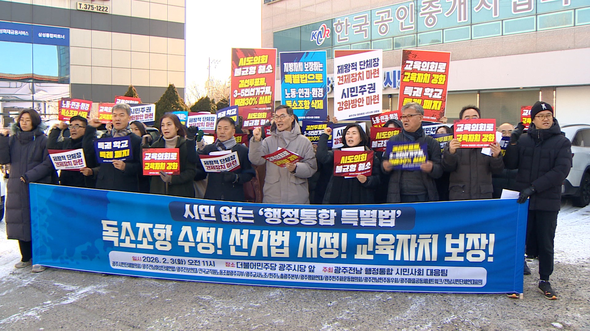 광주전남시민사회가 행정통합 특별법 특례조항 수정을 요구하며 릴레이 피켓시위에 돌입했습니다.자치분권 행정통합 완성과 정치개혁을 촉구하는 광주전남시민대응팀을 구성한 지역 11개 시민사회단체는 오늘(3) 민주당 광주시당 앞에서 기자회견을 열고"행정통합 후 권한 집중을 견제할 장치가 부족하다"며 특례법 독소 조...
