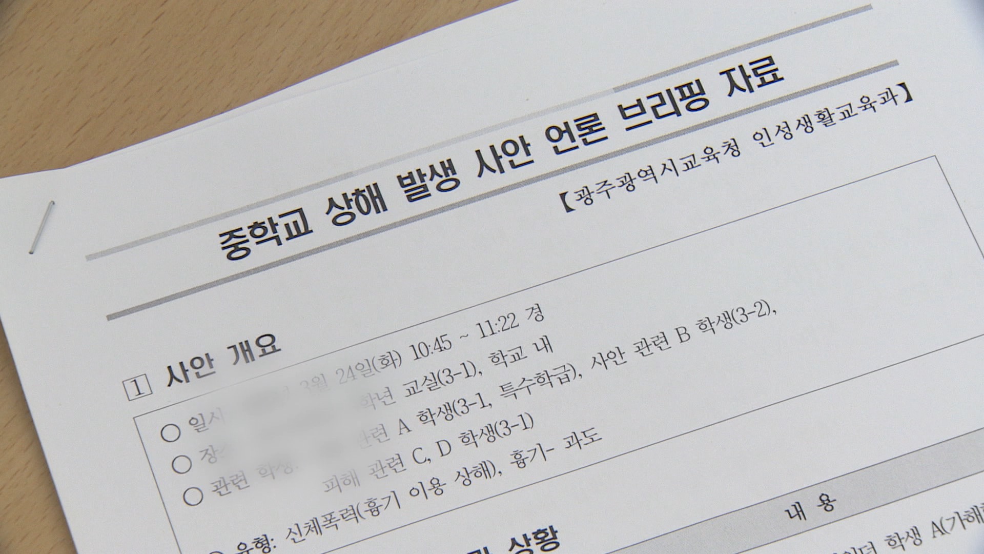 광주시교육청이 서구의 한 중학교에서 발생한 흉기상해 사건과 관련해 전방위적인 지원 체계를 마련했다고 밝혔습니다.박철영 광주시교육청 교육국장은 오늘(25) 브리핑을 열고 "피해 학생들에 대한 교육청 차원의 지원을 약속했다"며"심리적 불안을 호소하는 가해 학생에 대해서도 지원받을 수 있는 방안에 대해 안내했다"...